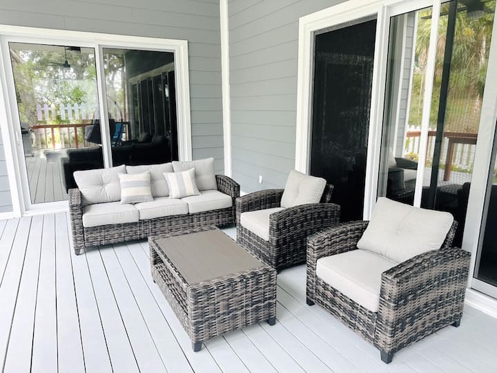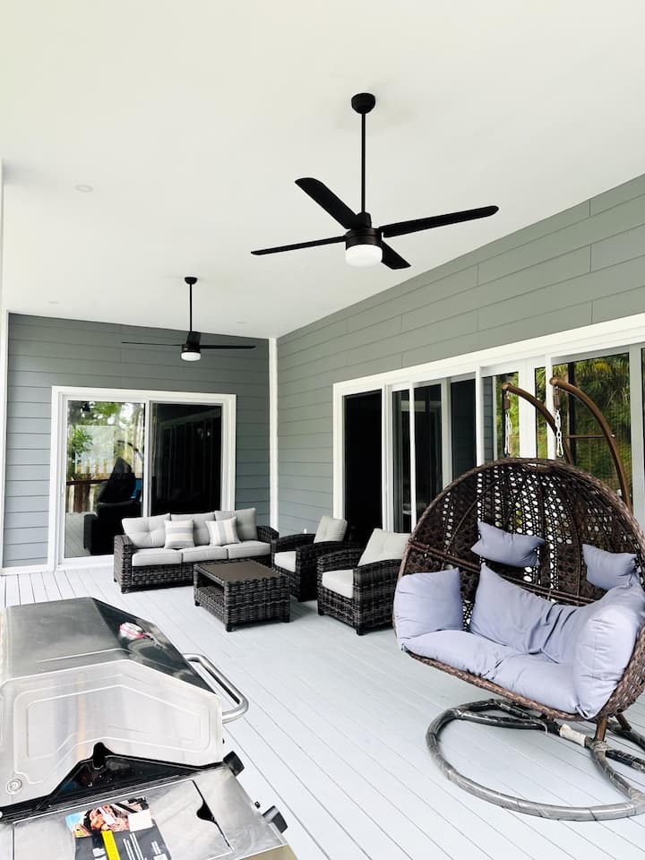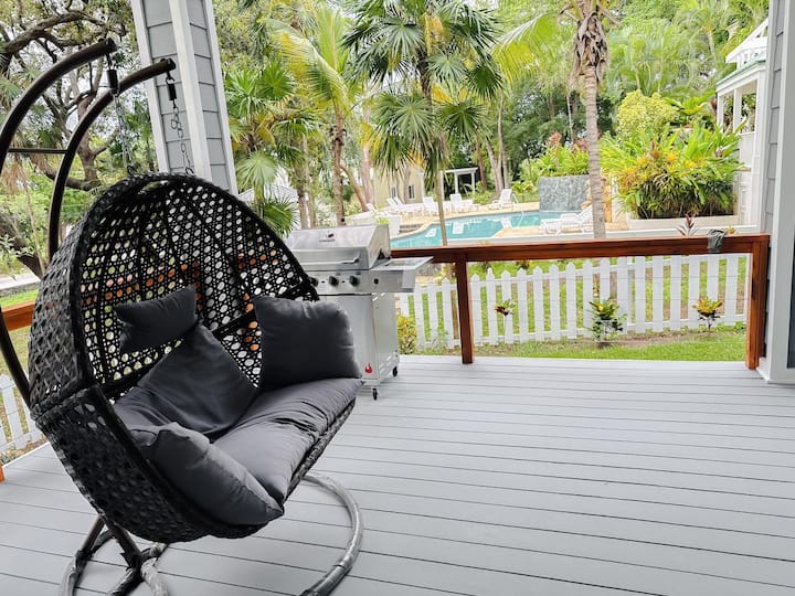 The open-plan living area is perfect for socializing, leading to a fully equipped kitchen with modern appliances and a large dining space. Outside, the community pool offers a refreshing escape, while the patio area is perfect for lounging and dining al fresco.
